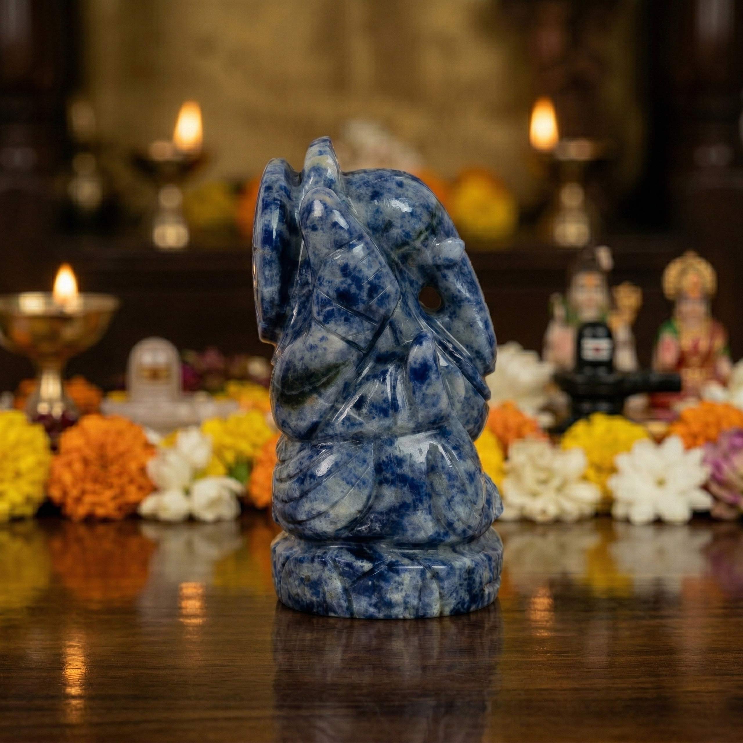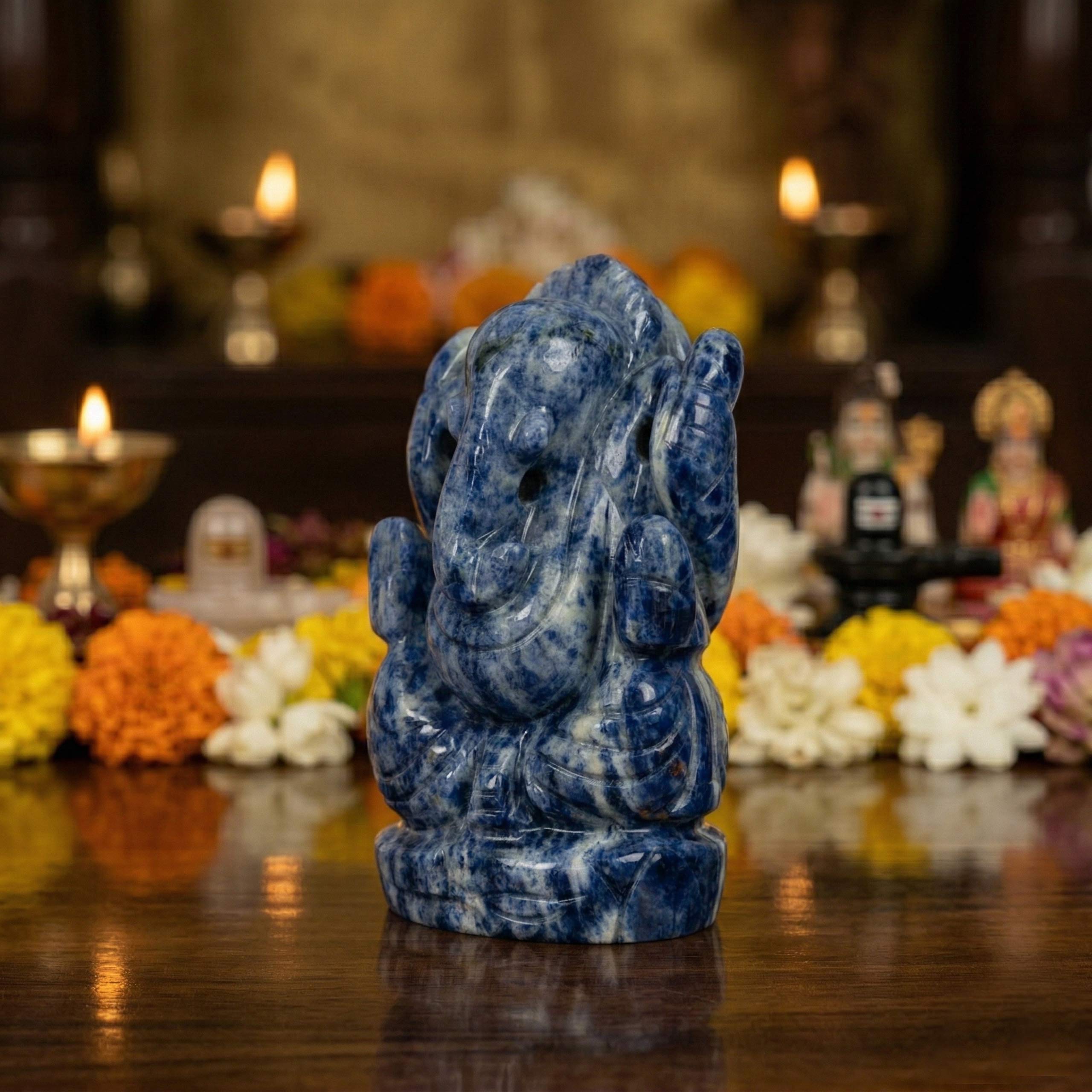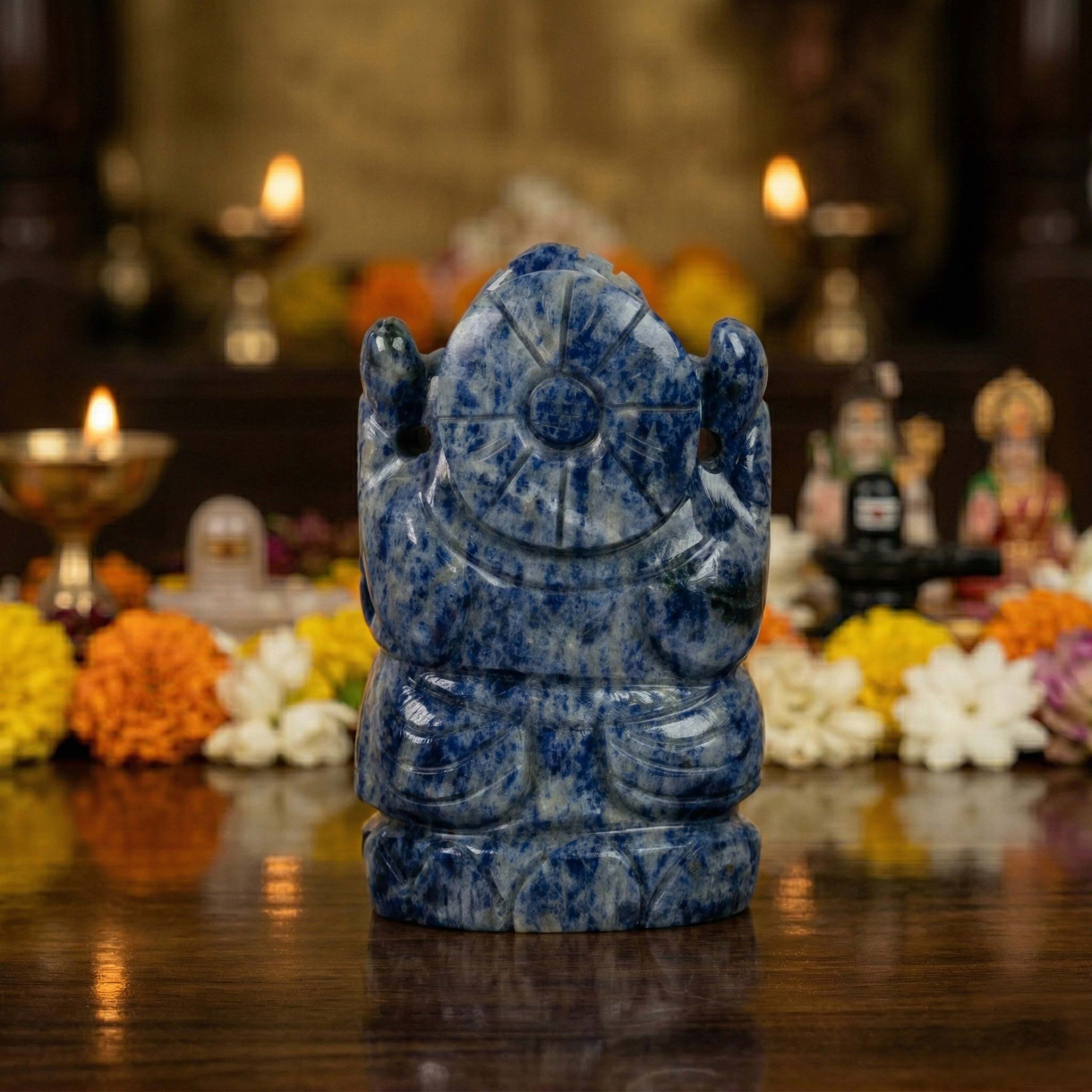 Each idol is sculpted from authentic Lapis Lazuli crystal, preserving the natural mineral textures and unique color variations found in the stone. Because it is carved from natural material, every Lapis Lazuli Ganesh idol displays slightly different patterns and tones.